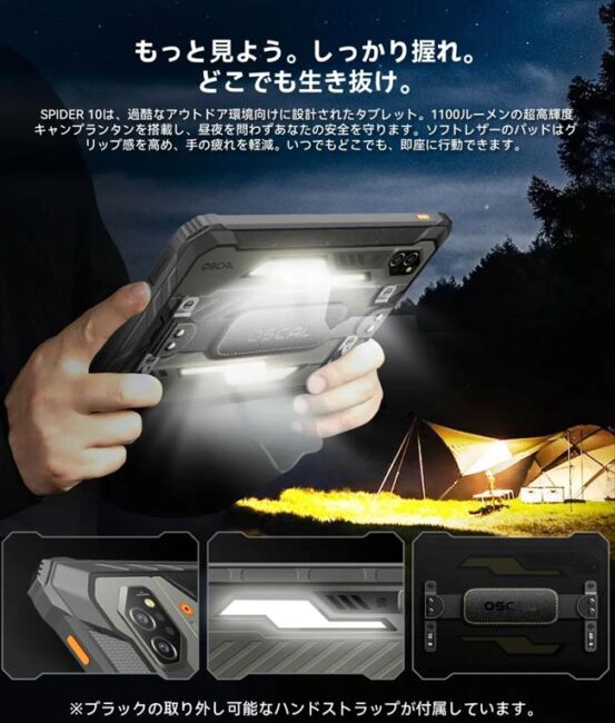 アウトドア向け端末として1100ルーメンの明るいランタンが搭載されています。動画を観ながら後ろでランタンという状況は考え難いですが、いざという時の灯りとして役に立ちそうです。