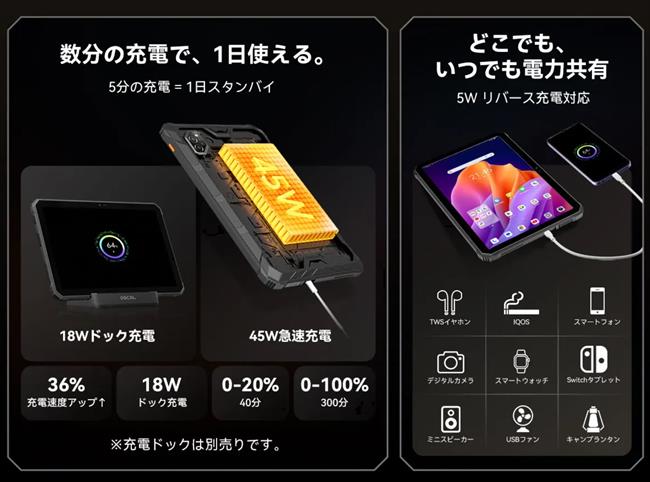 20,000 mAhの大容量バッテリーを搭載しているのが特徴です。45W急速充電対応までの高速充電に対応しています。