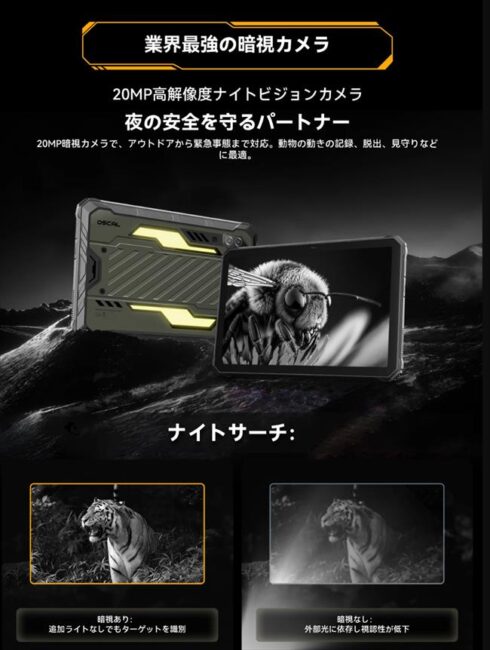 背面カメラの20MP側は暗所カメラ「ナイトビジョンカメラ」となっており、暗所での撮影を可能にします。