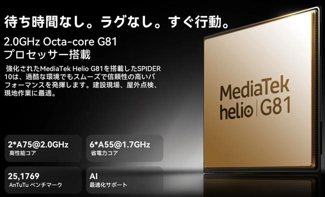 SoCにはMediaTekのプロセッサー MediaTek Helio G81を搭載。AnTuTuベンチマークでは251,769点(公式発表値)。エントリークラスの性能です。