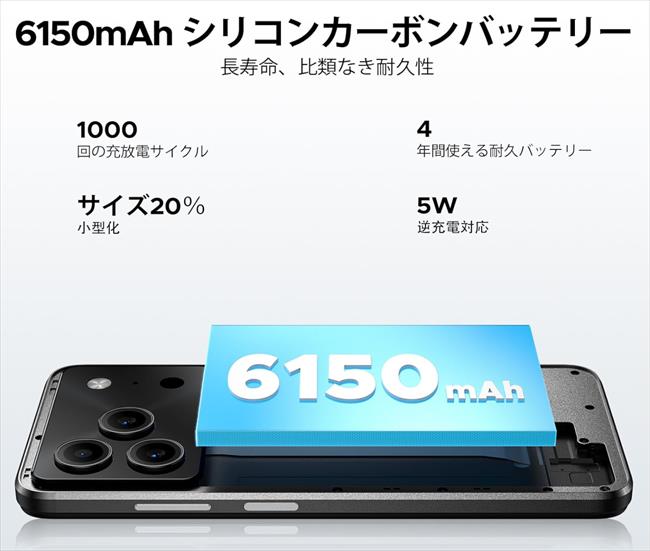 6,150mAhの大容量バッテリーを搭載しており、OTGリバース充電に対応しています。