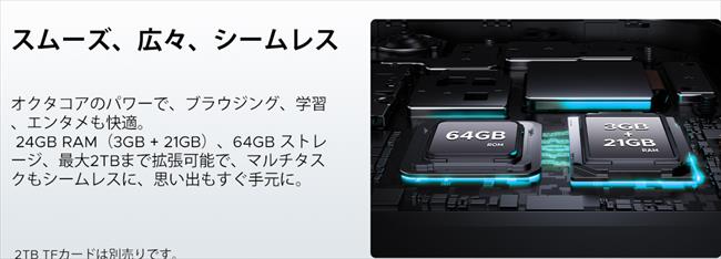 メモリ、ストレージ構成は、RAM4GB (21GB追加拡張可能)/ストレージ64GB。