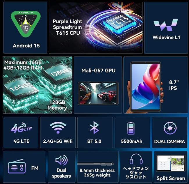 搭載するプロセッサーは、Unisoc T615 オクタコアプロセッサーを採用 。エントリーレンジの端末となります。メモリー構成は、 内部ストレージ128GB、RAM 4GB(+12G増設可能)を搭載しています。