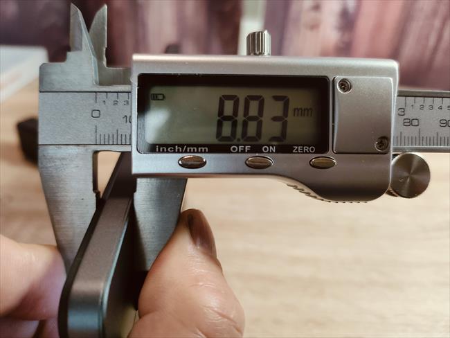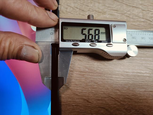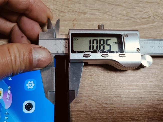 端末の厚みは約7.5mm。実測画像では保護ガラスの分厚いです。