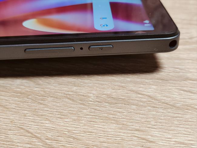 縦持ち時の右側には、電源ボタン、ボリュームボタン、イヤホンジャックが配置されています。