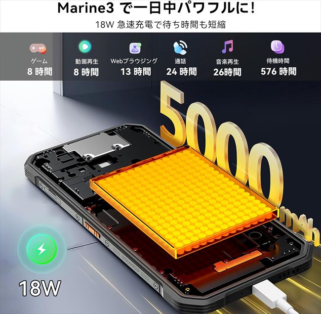 バッテリー容量は5000mAhです。18Wの有線急速充電に対応していますが、無線充電(ワイヤレス充電)には非対応です。