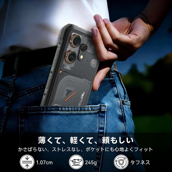 OSCAL MARINE 3は、厚さ10.7mmというタフネススマホとしては比較的薄型のボディに、IP68/IP69K/MIL-STD-810Hの耐久性を詰め込んだモデルです。処理性能はエントリークラスですが、最新のAndroid 16ベースのOSやナイトビジョンカメラなど、機能面に特徴があります。