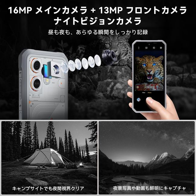 リアカメラは2眼構成です。メインカメラ (16MP): 通常の記録撮影用です。Google Lensに対応しています。ナイトビジョンカメラ (13MP): 赤外線センサーを利用し、完全な暗闇でも白黒で撮影が可能です。夜間のアウトドアや暗所作業に適しています。