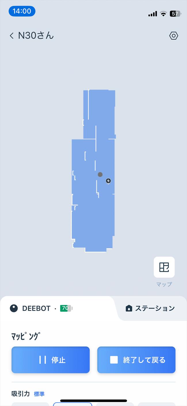 初回のお掃除の時は、部屋のマッピング(地図作成)しながら掃除をしてくれます。マッピングの速度が速く、軽く走行しただけで、あっという間に部屋の見取り図を作成してくれました。▼