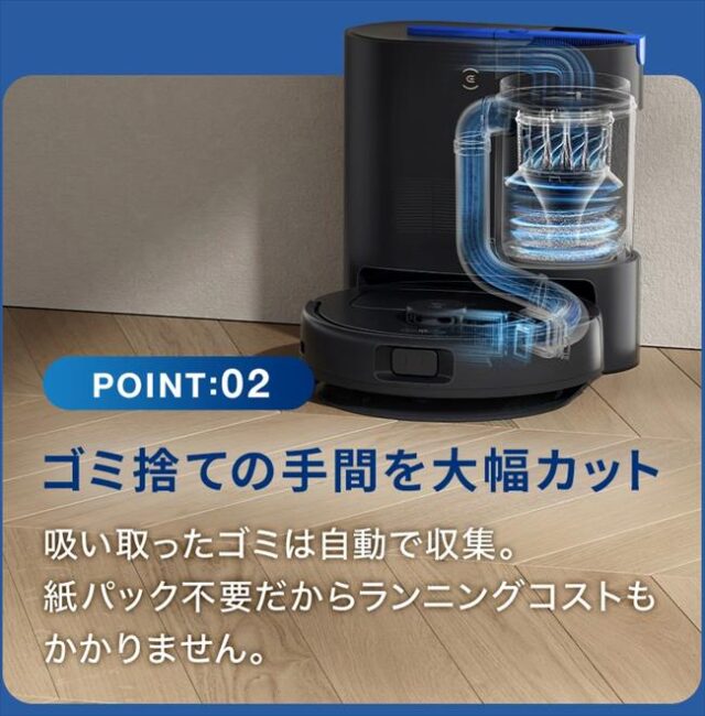 それに加えて、毎回掃除終わりには 「ゴミ収集ステーション」に自動的にゴミ捨てを行うので、都度のゴミ捨ての必要がありません。