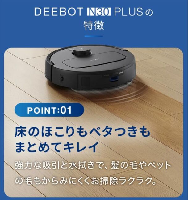 DEEBOT N30 PLUSは、クリーナーとしての吸引掃除に加え、モップシステムで水拭きも同時にこなせる1台2役のお掃除ロボット。