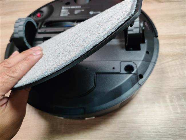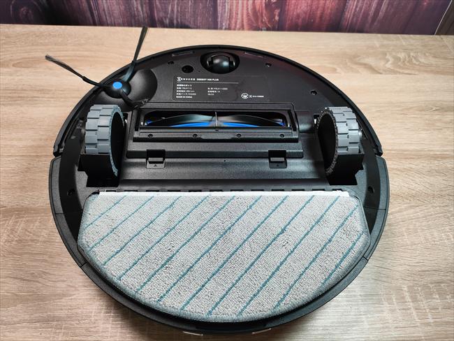 裏側をひっくり返すとタイヤとメインブラシ、サイドブラシ、モップが確認できます▼