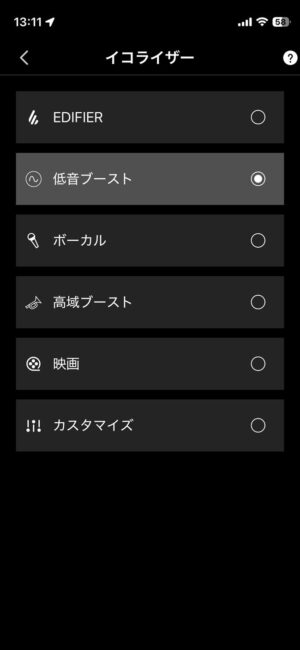 専用アプリのEQ機能を使う事で、音の傾向を変える事もできます。ちなみにイコライザーで「高音ブースト」にしてみても、低音が強いです。