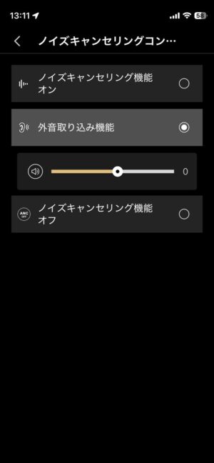 外音取り込み(アンビエントサウンド)は、デジタル的に外音を取り込む機能で、会話や環境音を聞きながら音楽を楽しむ事ができる機能です。