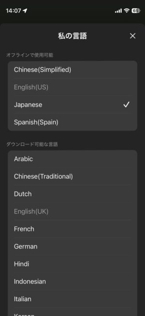 翻訳には専用アプリを使います。アプリの右上の「翻訳」をタップして、自分の言語と相手の言語を選択します。