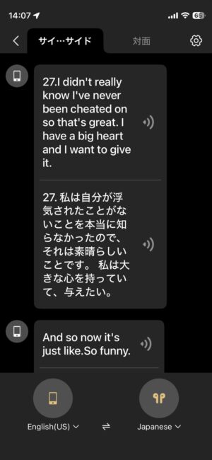 アイコンをタップすると話を聞くリスニング状態に入り、音声が途切れると自動的に画面上に翻訳され、翻訳音声が流れます。
