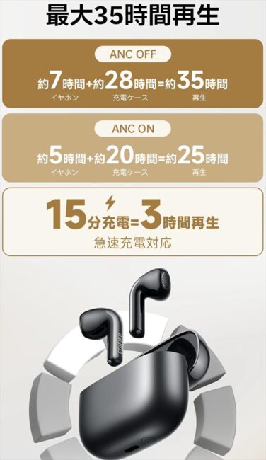 ※ANCがオンの時は約5時間、ケースを含めて25時間です