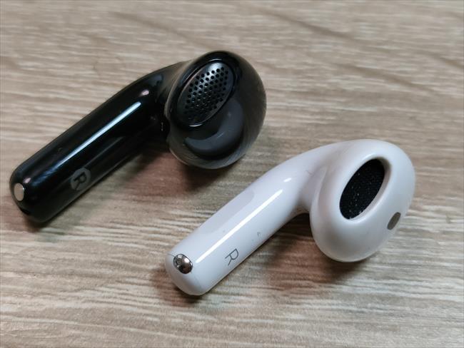 Apple のAIrPods 4と並べてみます。サイズ、グリルの角度ともに似てます。