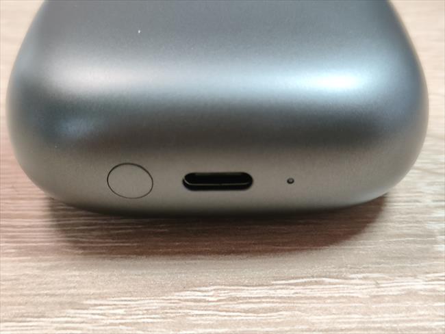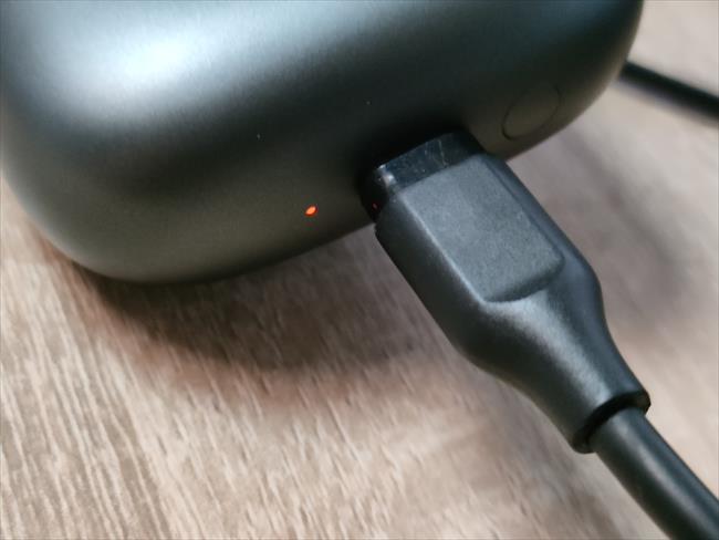 ケースにはインジケーターは、1灯だけついていますがバッテリー残量は確認できません。ペアリングモード時にはLEDが赤・白の順で点滅します。充電中はオレンジ、満充電で白に変わります。