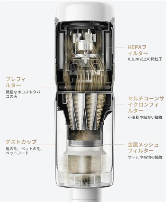 高級掃除機として知られるダイソンと同様の「マルチコーンサイクロン方式」を採用しています。