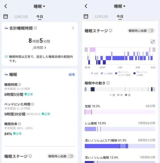 睡眠の機能をチェックしてみました。Apple Watchでの睡眠データとほぼ同じ結果でしたので、精度は信頼できます。