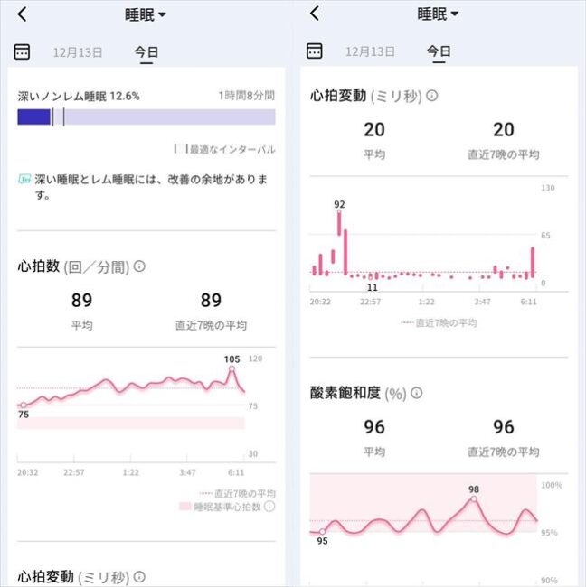 睡眠の機能をチェックしてみました。Apple Watchでの睡眠データとほぼ同じ結果でしたので、精度は信頼できます。