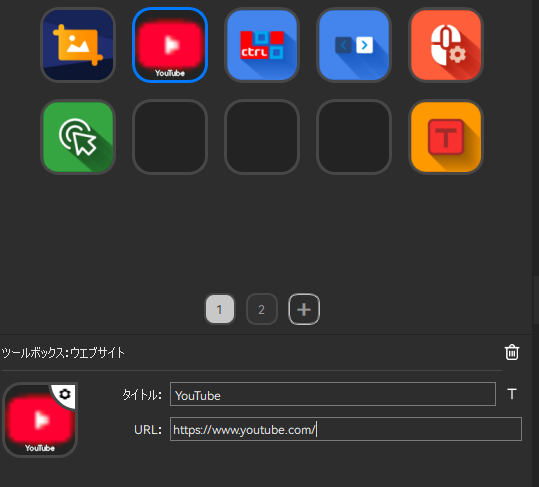 例えば「ツールボックス>>ウエブサイト」では、サイト名とURLを設定するとサイトのアイコン(ファビコン)を自動的に取得してボタンに配置されます。このボタンを押せば一発でサイトを起動できます。