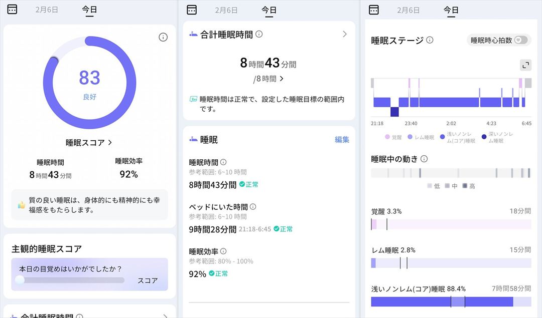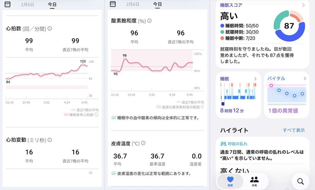 睡眠の機能をチェックしてみました。Apple Watchでの睡眠データとほぼ同じ結果でしたので、精度は信頼できます。