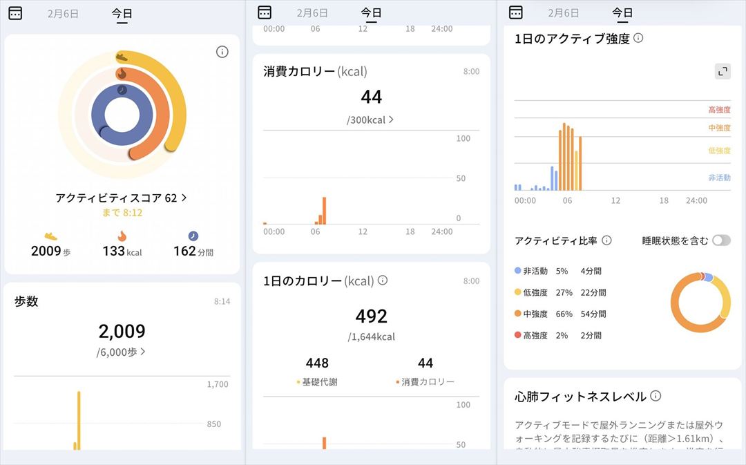 アクティビティ中の歩数や消費カロリーは RingConn Gen2 Air単体で記録可能ですが、ウォーキングやランニングなどのフィットネスログを記録することはできません。