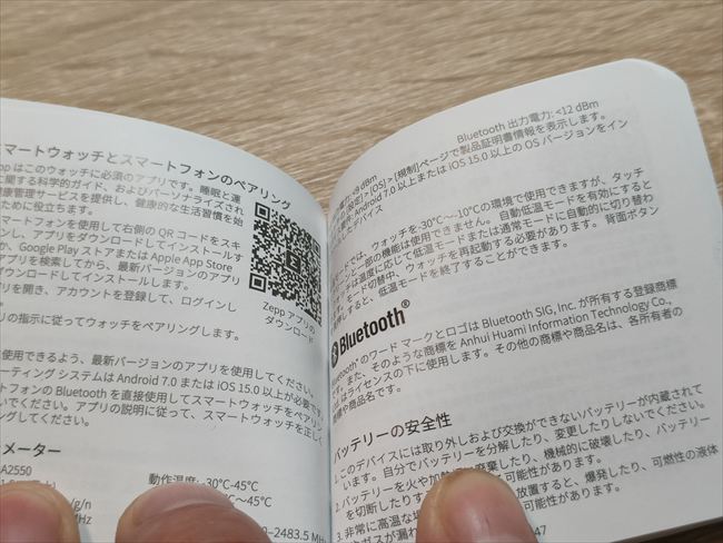 取扱説明書はマルチ言語版。日本語での表記もありますがペアリングと専用アプリのQRコード程度の内容だけです▼