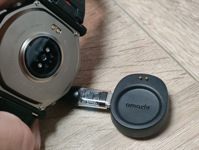 充電はAmazfit お馴染みの専用クレードルを使うタイプ。マグネットでピタッと貼りつきますが、電極があるので決まった方向のみ貼りつきます▼
