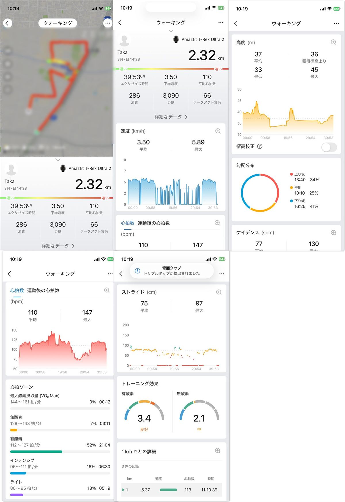 この画面では、間隔・距離・ペース・歩数・スピード・高度・坂・消費・心拍数など、好きなデータを表示、並び替えが可能です。