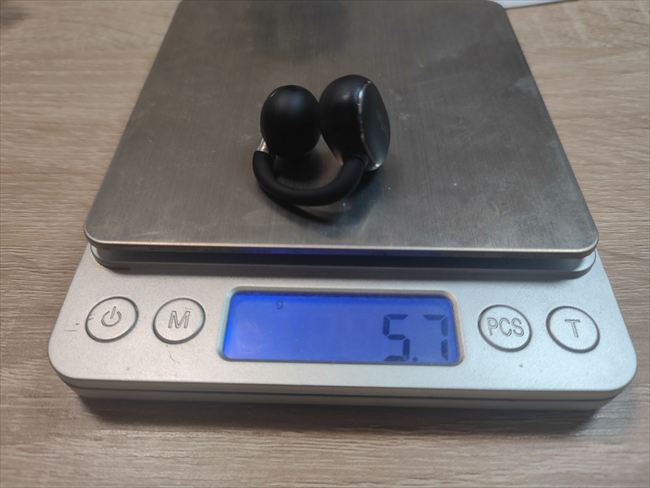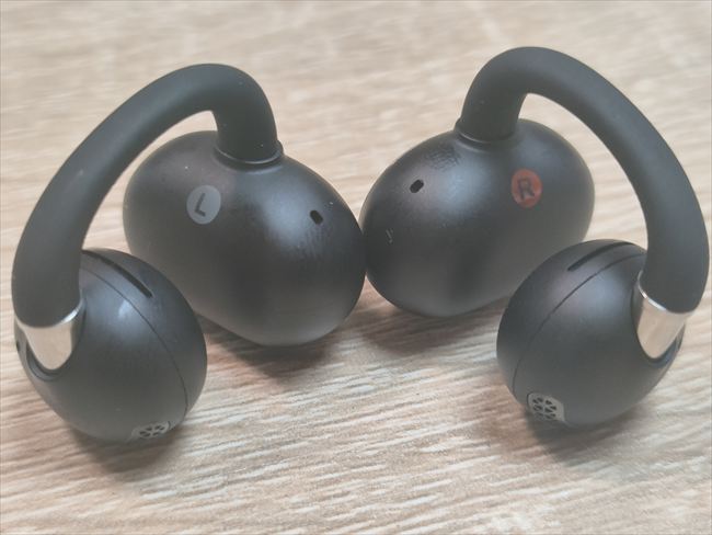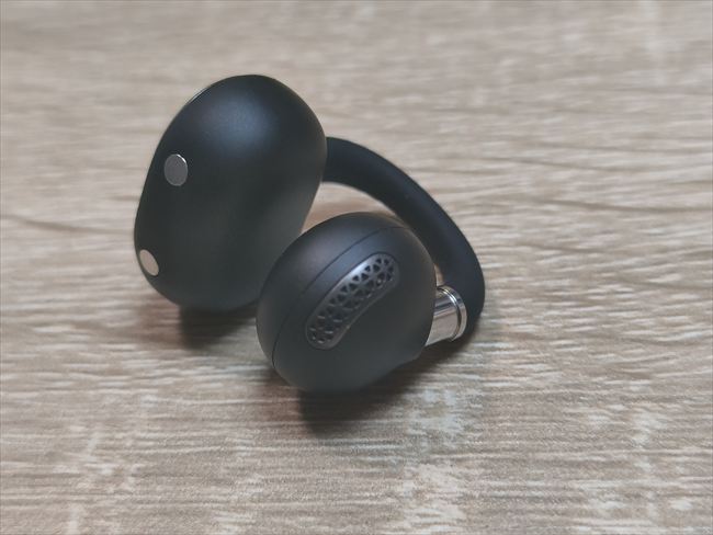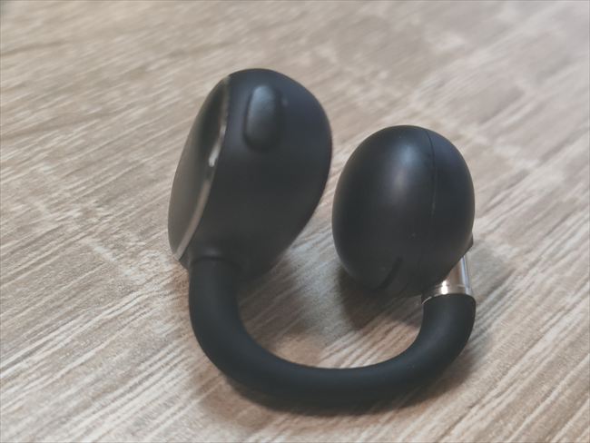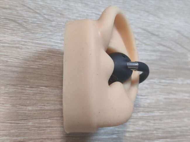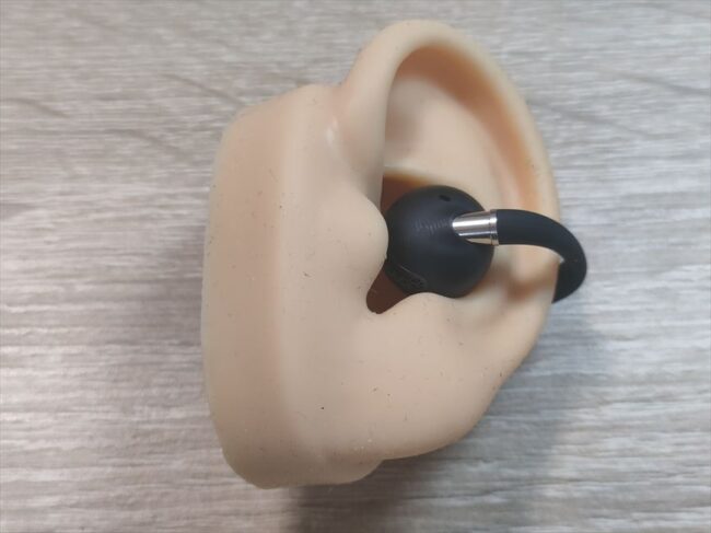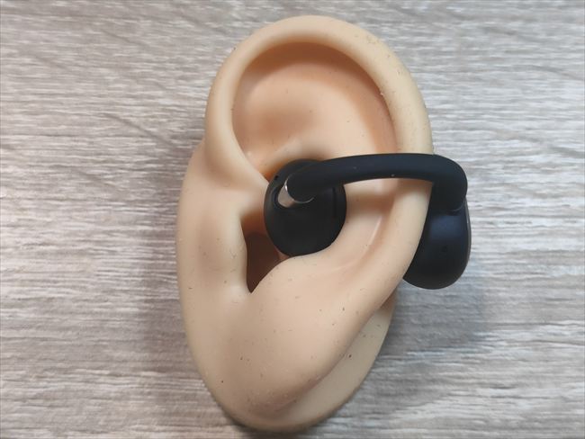 イヤーカフ型なので、耳に真横になるように装着します。他のイヤホンとは装着感が全く異なります。