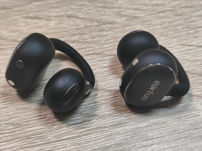 イヤホン形状はイヤーカフ型。カラーはブラック。マットブラックですね。Earfunのロゴがある方が耳の後ろにきます▼