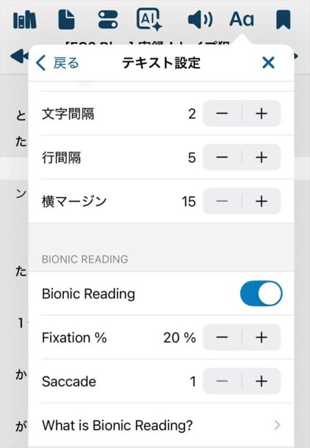 「テキスト設定」の「フォントと間隔」からBionic Readingをオンにすると有効になります設定項目のsaccade(眼球運動)は、太文字の間隔の設定です。