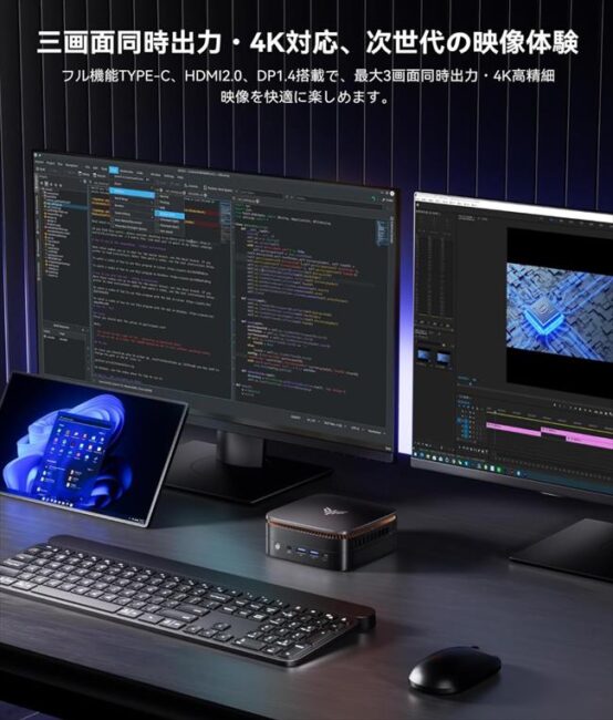 映像は、USB-C、HDMI、DPから3画面同時に出力できます。