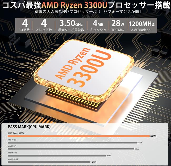 CPUにはRyzen 3300U を搭載。PASSMARKは5723としています。性能は限定的ですが、テレビやモニターにつけて、オフィス文書作成や動画鑑賞、ネットサーフィンくらいならサクサク動きます。