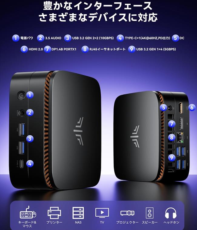 インターフェイスは、PD・映像出力に対応したType-Cが1口。USB3.2 GEN2 x2、USB 3.2 Gen1 x 4、HDMI2.0 x1 、3.5インチオーディオジャックx1、RJ45ポートx1、DPポート x1と豊富です。