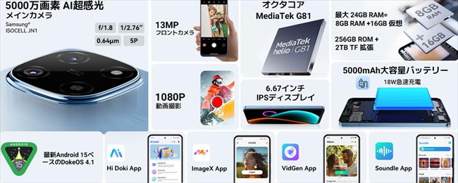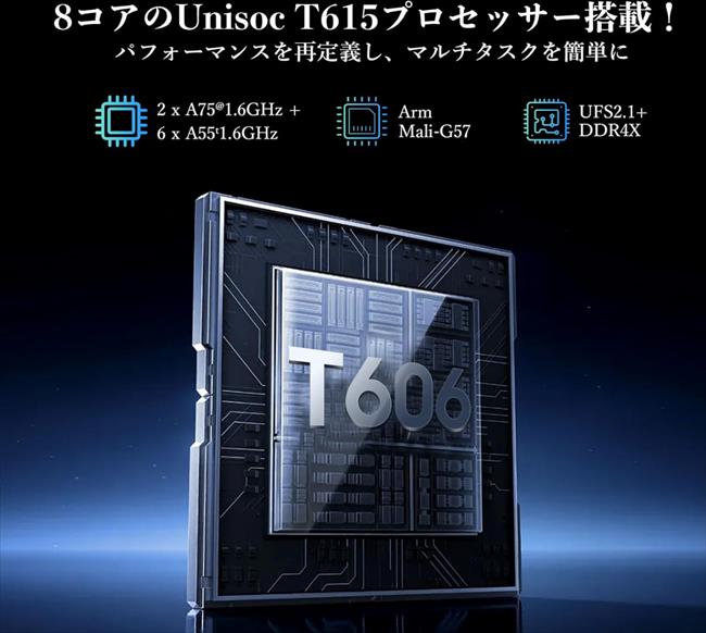 Unisoc T606の8コアCPUと24GBの大容量メモリ、256GBの内蔵ストレージ、2TBまでの拡張対応です。