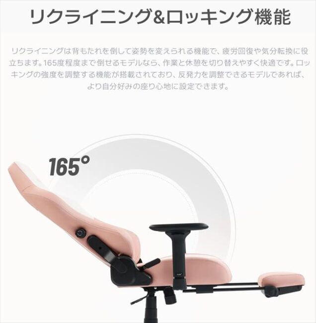 95°~165°のリクライニング機能と背座ロッキング機能を備え、集中時から休憩時まで自在に角度調整が可能です。内蔵型の収納式オットマンはワンタッチで引き出すことができ、足を伸ばしたり、短時間の仮眠を取ったりする際にも最適です。ヘッドレストと組み合わせることで、身体をしっかりと支えながら深くくつろげる快適な休息姿勢を実現します。