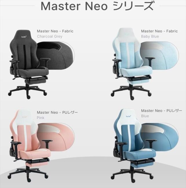 Boulies Master Neoは、日本人の体型や生活習慣に特化して設計された日本限定モデルです。日本人の平均身長に合わせた座面高42~53cmを採用し、骨盤を立てて正しい姿勢を保ちやすい構造を実現しました。背骨のカーブに沿ってフィットする4方向調整式ランバーサポートにより、長時間の使用でも腰への負担を効果的に軽減します。素材にはPUレザーとファブリックを採用。グローバル市場ではPUレザー製のPink(ピンク)とBlue(ブルー)の2色を展開していましたが、日本市場ではこれらに加えて、ファブリック製の日本限定カラーであるCharcoal Grey(チャコールグレー)とBaby Blue(ベイビーブルー)の2色を新色としてラインアップに加え、全4色を展開します。ホームオフィスにもなじむ落ち着いたデザインで、日常のさまざまなシーンに快適な着座環境を提供します。
