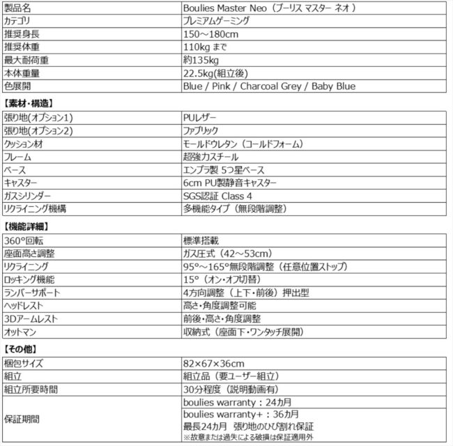 ゲーミング&オフィスチェアの開発・製造に特化した株式会社ブーリスは、日本人の体型や生活習慣に合わせて開発した日本限定モデル「Boulies Master Neo(ブーリス マスター ネオ)」を、2025年11月17日(月)11:00より公式オンラインストア及び公式Amazonストアにて先行予約受付を開始し、11月26日(水)午前10:00から正式発売いたします。