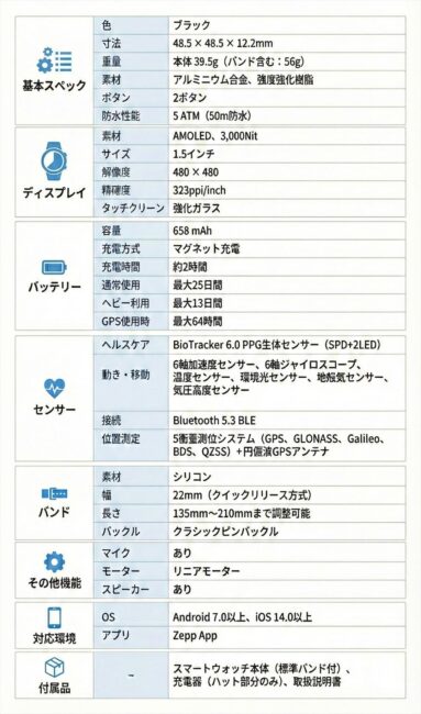 Amazfit Active Maxは、1.5インチAMOLED大画面ディスプレイ(最大輝度3,000nit)、658mAhの大容量バッテリー(最大25日間持続)、4GBの大容量ストレージ、スピーカー・マイク内蔵、GPT4.oを統合したAI音声操作システム「Zepp Flow」搭載 。トップクラスの競合製品に匹敵する性能にも関わらず、低価格で実現した高コスパのスマートウォッチです。