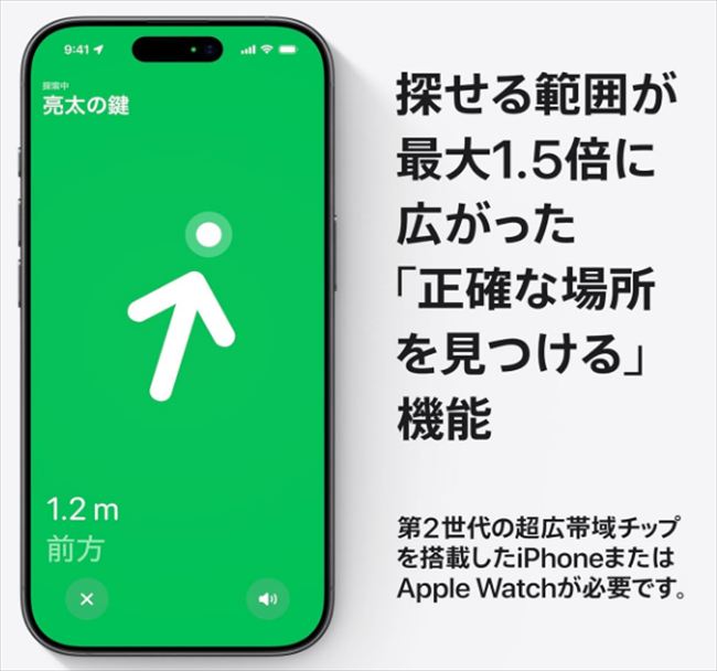 3. Bluetooth通信範囲の拡大 「正確な場所を見つける」機能(UWB)だけでなく、通常のBluetooth通信範囲も拡大しています。これにより、少し離れた場所からでもiPhoneとの接続が維持されやすくなっています。
