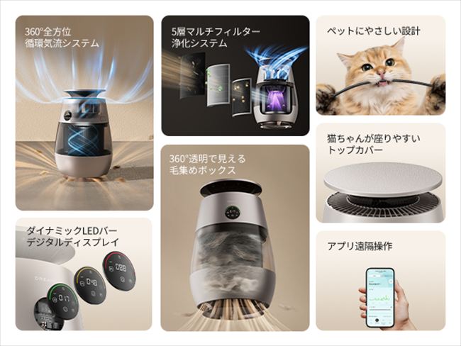 ・主な特長: 360°吸引/5層フィルター/透明ヘアキャッチボックス/空気質リアルタイム表示/アプリ対応