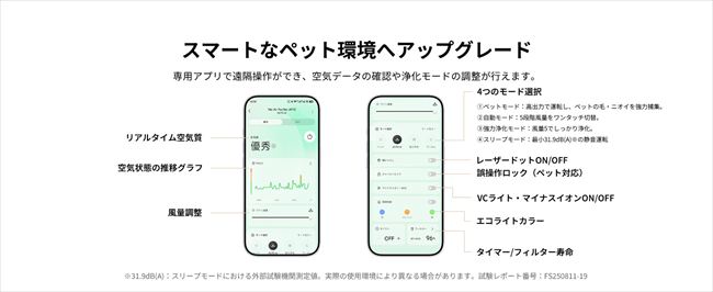 本体ディスプレイにより、空気質をリアルタイムで表示。さらに専用アプリ「Dreamehome」にも対応し、外出先からの確認や操作、フィルター管理なども可能です。