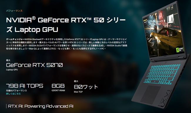 | GPU:RTX 50 シリーズ | 最新のBlackwellアーキテクチャ。DLSS 4対応で描画負荷をAIが軽減。 |