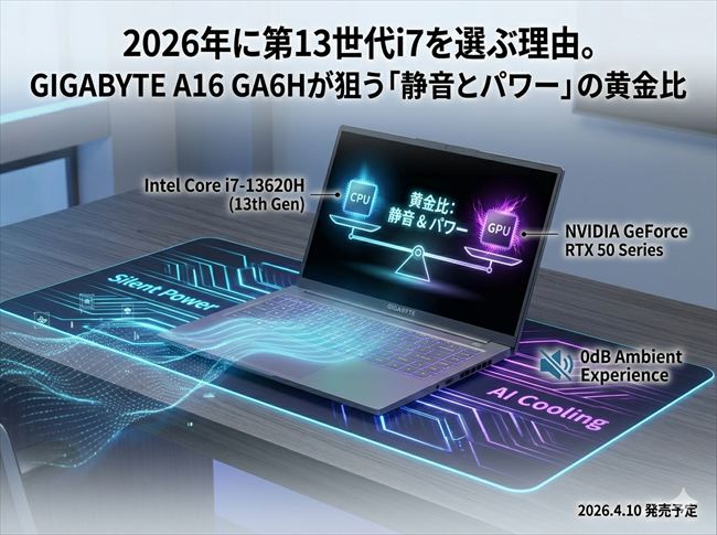 そんな中、4月10日に発売されるGIGABYTEの最新機「GAMING A16 (GA6H)」が心臓部に選んだのは、第13世代のIntel Core i7-13620Hです。